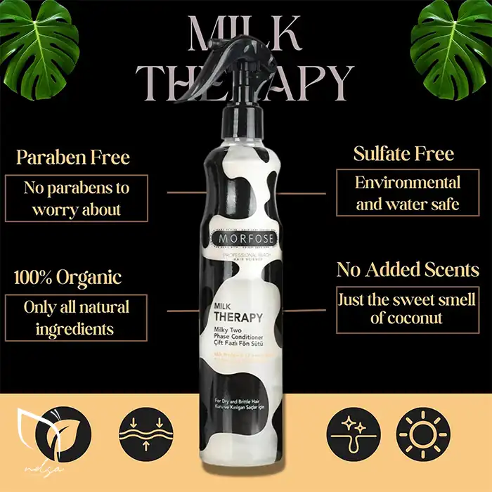 اسپری دوفاز مورفوس مدل Milk Therapy یکی از محبوبترین محصولات مراقبتی مو از برند ترکیه ای Morfose است که با ترکیب ویژهای از پروتئین شیر و مواد مغذی، به موها نرمی، لطافت و درخشندگی طبیعی میبخشد. این اسپری شیر مو مورفوس، مخصوص موهای خشک، آسیبدیده یا رنگشده طراحی شده و بدون ایجاد سنگینی، به بازسازی تارهای مو کمک میکند.
