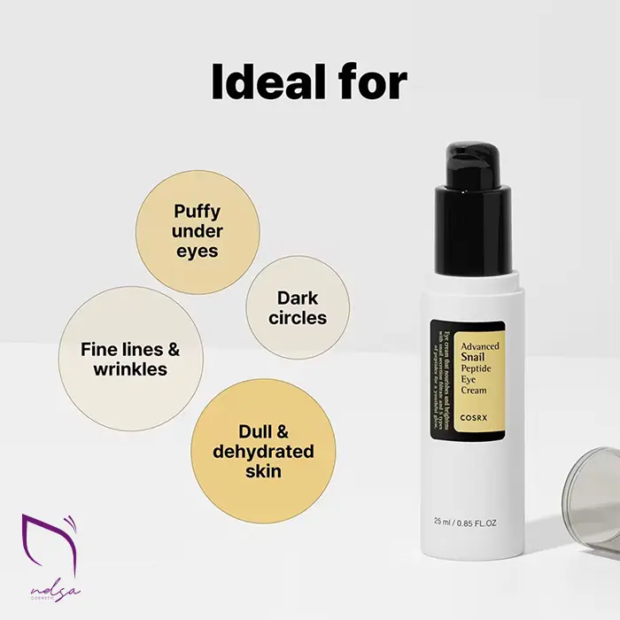 دور چشم جوانساز کوزارکس COSRX Advanced Snail Peptide Eye Cream یک کرم تخصصی برای مراقبت از پوست ظریف اطراف چشم است که اثرات ترمیمی و احیاکننده دارد. این محصول با ترکیبی از ترشّح حلزون (Snail Secretion Filtrate)، پپتیدها و ترکیبات مرطوبکننده، به کاهش خطوط ریز، تیرگی و پف زیر چشم کمک میکند. بافت سبک و غیرچرب آن باعث جذب سریع و بدون احساس سنگینی میشود. این کرم برای استفاده روزانه، هم در صبح و هم در شب، مناسب است و میتواند زیر آرایش هم استفاده شود.