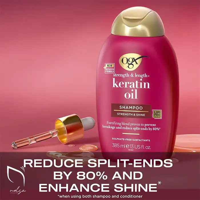 شامپو روغن کراتین او جی ایکس (ogx)، شامپویی فوق العاده برای نشان دادن تاثیر کراتین به شماست که به سادگی میتوانید از آن بهرهمند شوید. روغن کراتین در فرمولاسیون این شامپو، با نفوذ به تارهای مو باعث بالا رفتن خاصیت کشسانی موها و در نتیجه افزایش مقاومت هر تار مو در برابر شکسته شدن یا موخوره میشود.