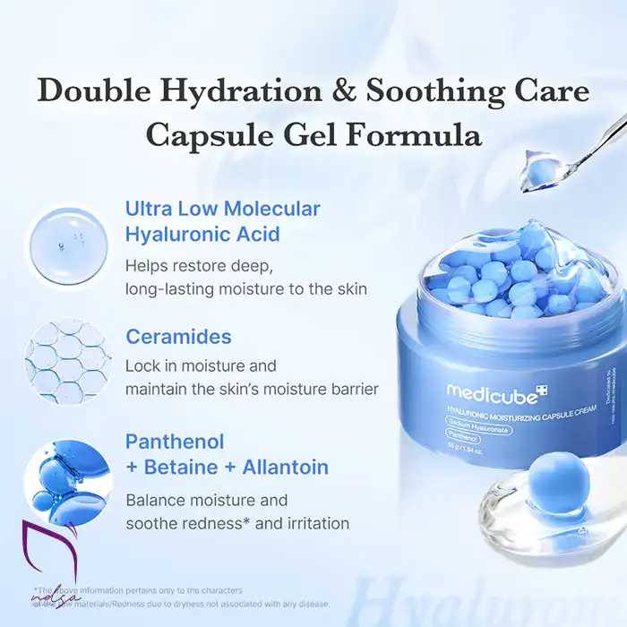 کرم کپسولی هیالورونیک اسید مدی کیوب یک مرطوبکننده و آبرسان پیشرفته از برند کرهای Medicube است که با ساختار کپسولی طراحی شده تا رطوبت را بهصورت هدفمند و مؤثر به پوست برساند. این محصول برای استفاده روزانه فرموله شده و تمرکز اصلی آن روی حفظ آب در لایههای پوست، افزایش نرمی و کمک به تقویت سد دفاعی پوست است. بافت خاص این کرم باعث میشود هنگام استفاده، ترکیبات فعال بهتدریج آزاد شوند و پوست حس سبکی همراه با رطوبت ماندگار را تجربه کند.